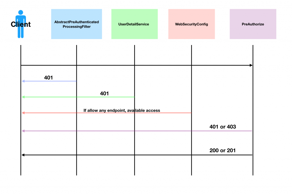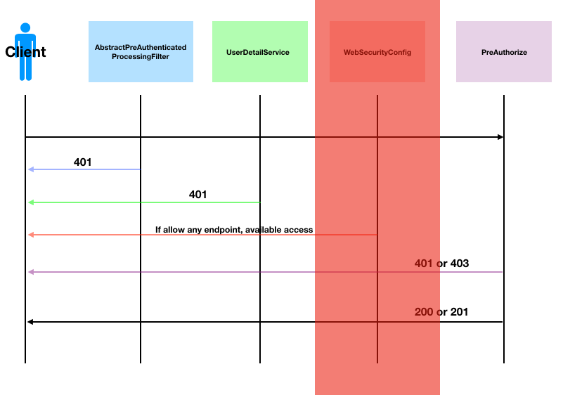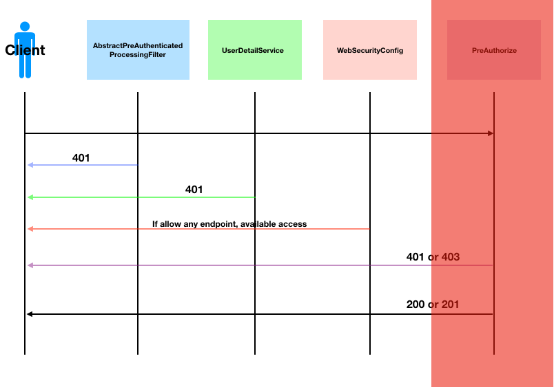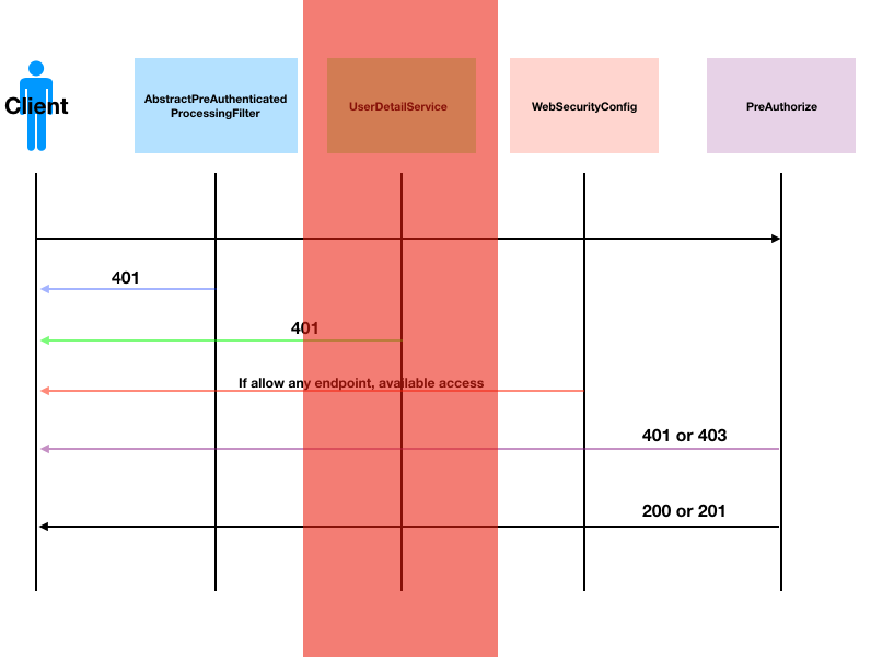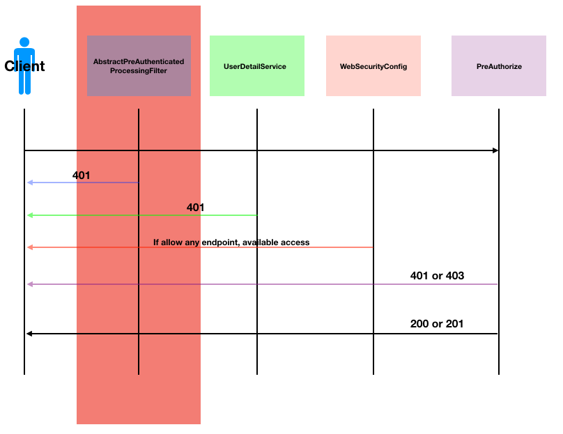 ユーザのクレデンシャル情報は、PreAuthenticatedAuthenticationTokenで処理されて、独自で実装するAuthenticationUserDetailsServiceの実装クラスに渡される。